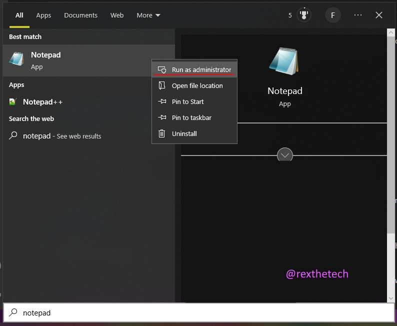 Start Notepad with Administrator rights by finding Notepad in your start menu, right-clicking on it, and choosing "Run as administrator":
