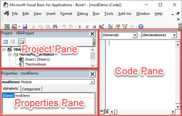 I will be referring to three sections in the editor. For lack of better terms, I'm going to call these sections the Project pane, the Properties pane and the Code pane.