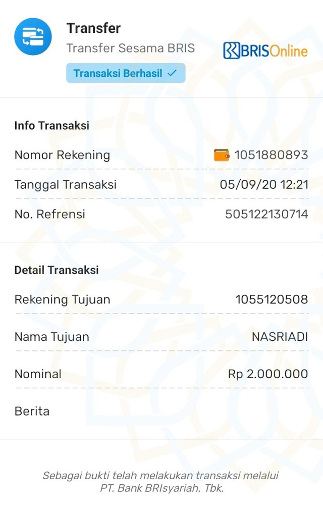 Saya langsung mentansfer uang kepada adik saya sejumlah Rp. 2.000.000 dengan aplikasi BRISOnline, lalu saya bekerja seperti biasa lagi.