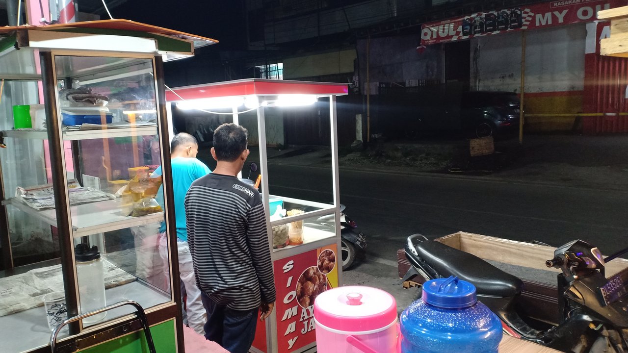 After maghrib prayer, as usual, I changed new coffee grounds and I cleaned up all the tables with cloth and then I prepared everything because sometimes it will be busy because tonight is usually busy Sunday night, then I turn on the light and I see there are already customers in front of my house . who sells somay.