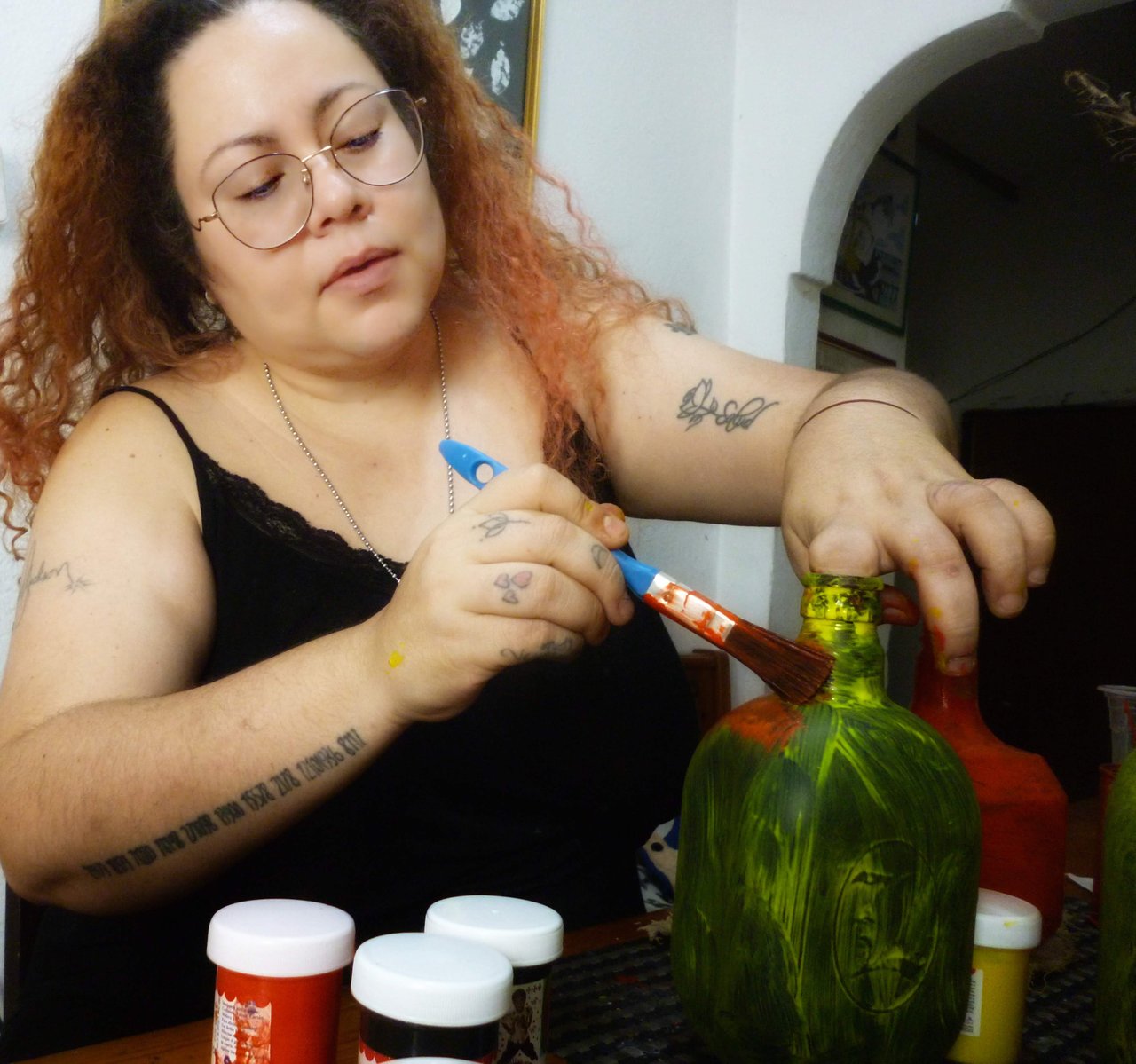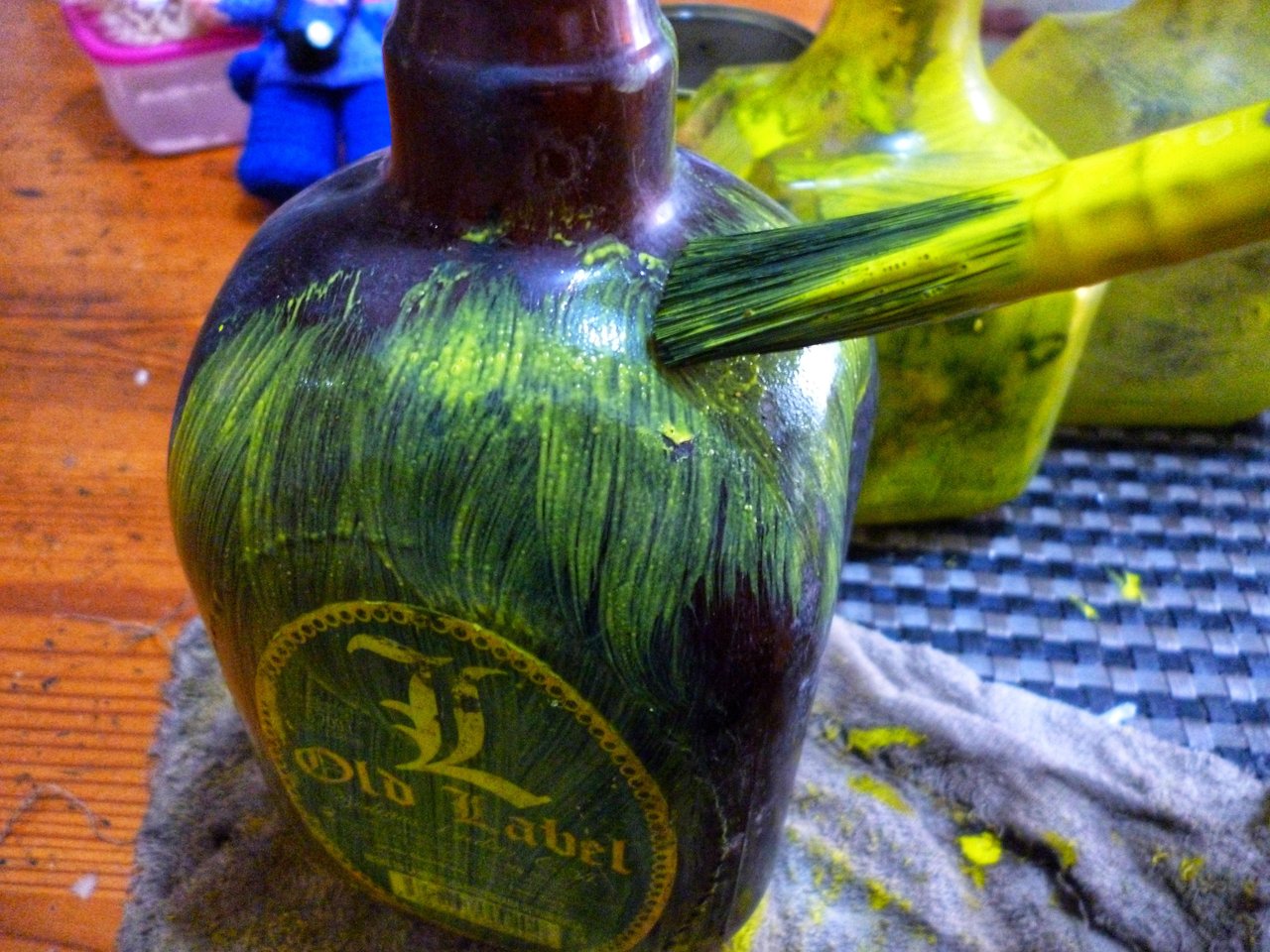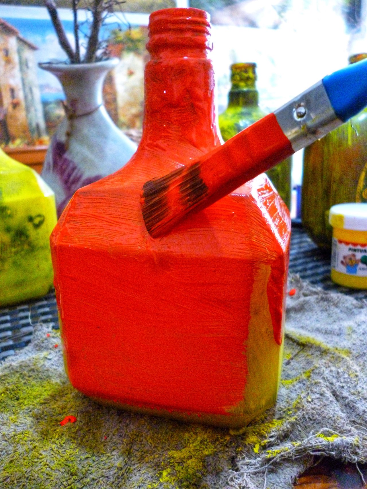 Once the paint is dry, we must give the container a minimum of 3 layers of paint of any color, because of its material, some will need more layers than others. Once the base paint dries, we choose the color or colors we want. I mixed various techniques from sparking, to brushing which consists of "brushing" with a brush with very little paint, another color and giving it depth.