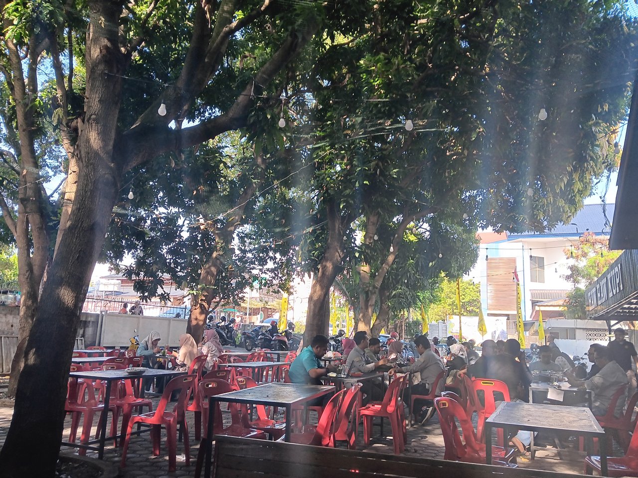 Baru kemudian saya telepon orang yang ditunggu. "Masih beresin absen," katanya. Dia juga berjanji akan segera meluncur ke lokasi. Tak lama kemudian, dia benar-benar tiba. Kami pesan minuman. Dia sarapan pakai lontong. 15K.