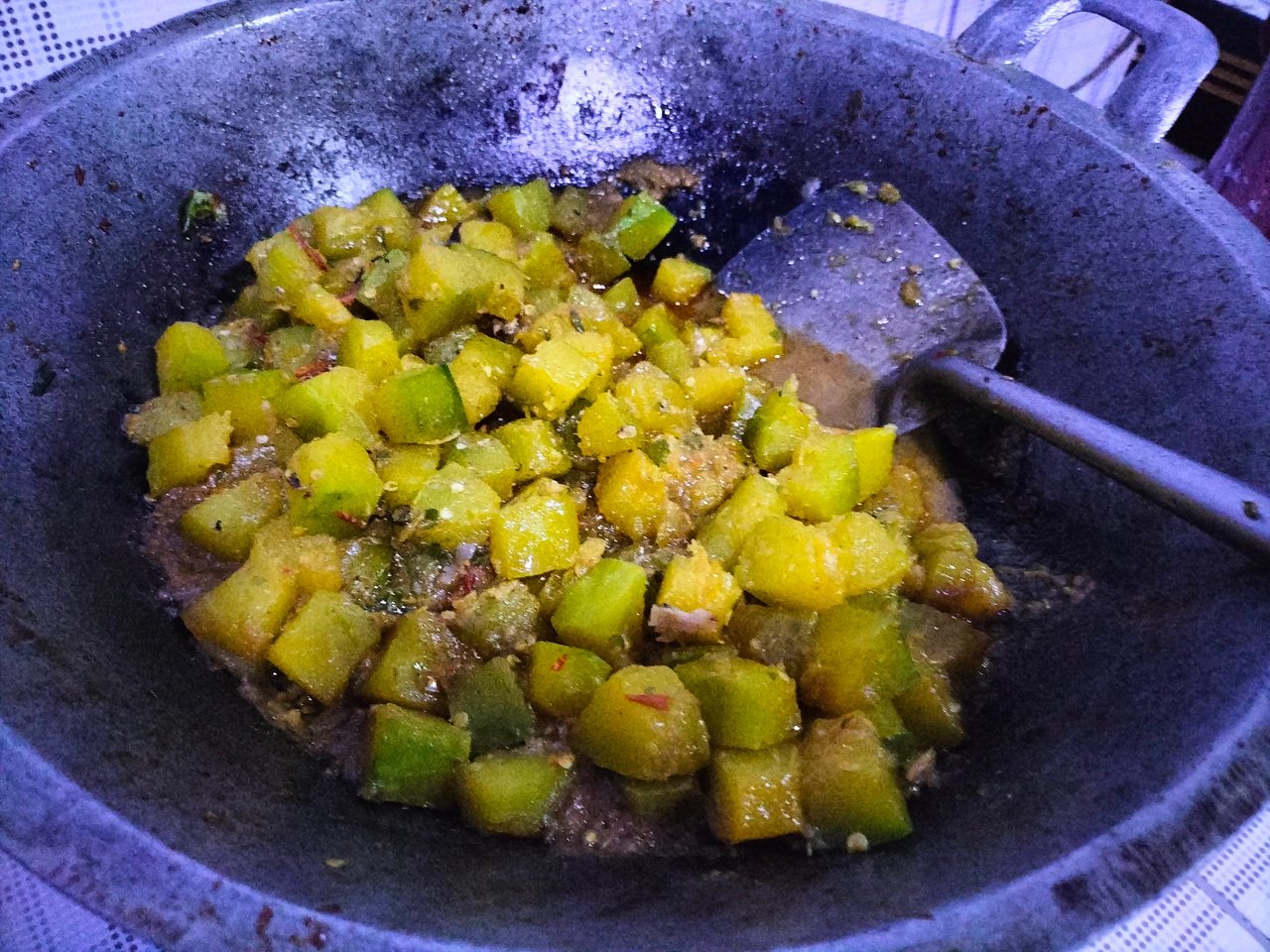 Sambil menunggu hujan, saya membersihkan labu yang rencananya akan di tumis. Setelah selesai, ibu mertua langsung membuat bumbu dan menumis labu tersebut.