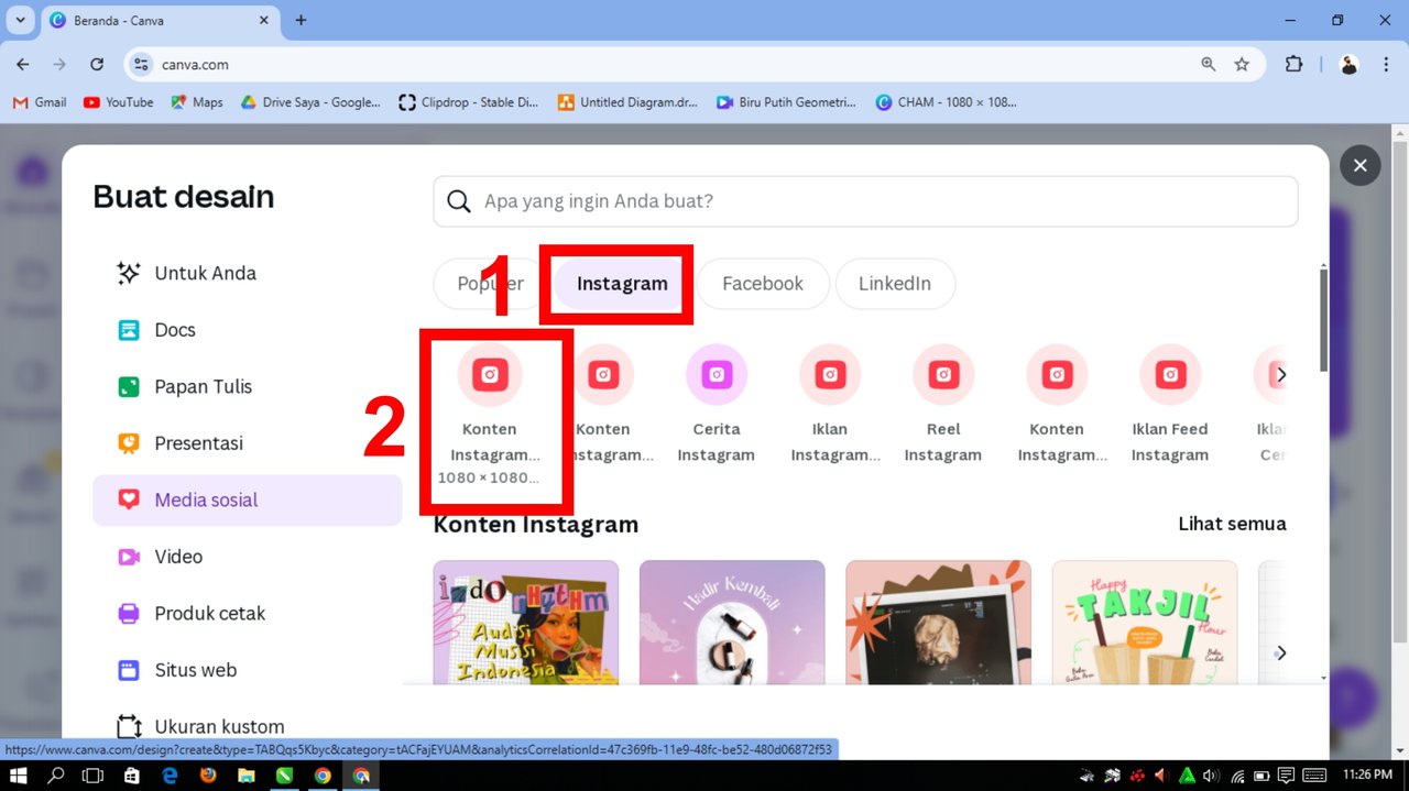 Saya melihat dalam desain ini hanya menggunakan ukuran persegi, jadi saya pergi ke templet yang sudah ada yaitu memilih ukuran desain Media Sosial.