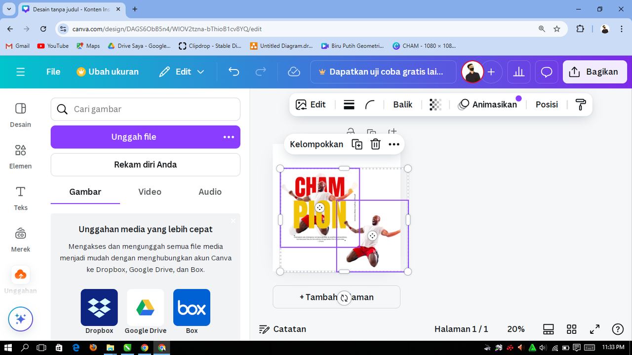 Selanjutnya saya akan letakkan bayangan tersebut ke belakang. Saya akan memilihkan posisi > mundur. Kemudian saya menambah tulisan "CHAM" dengan font "Anton", ukuran setelah saya sesuaikan adalah 236.
