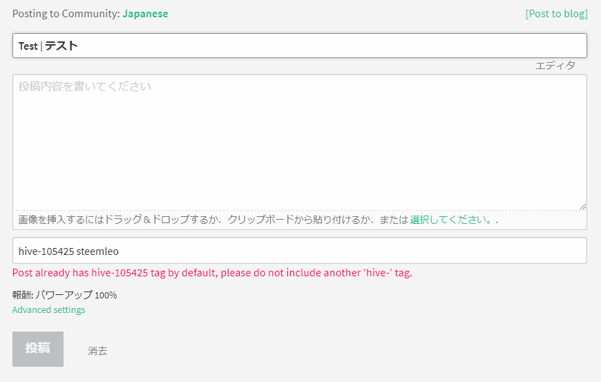 Steemitの場合は、hive-タグを付けるとエラーとなりました。