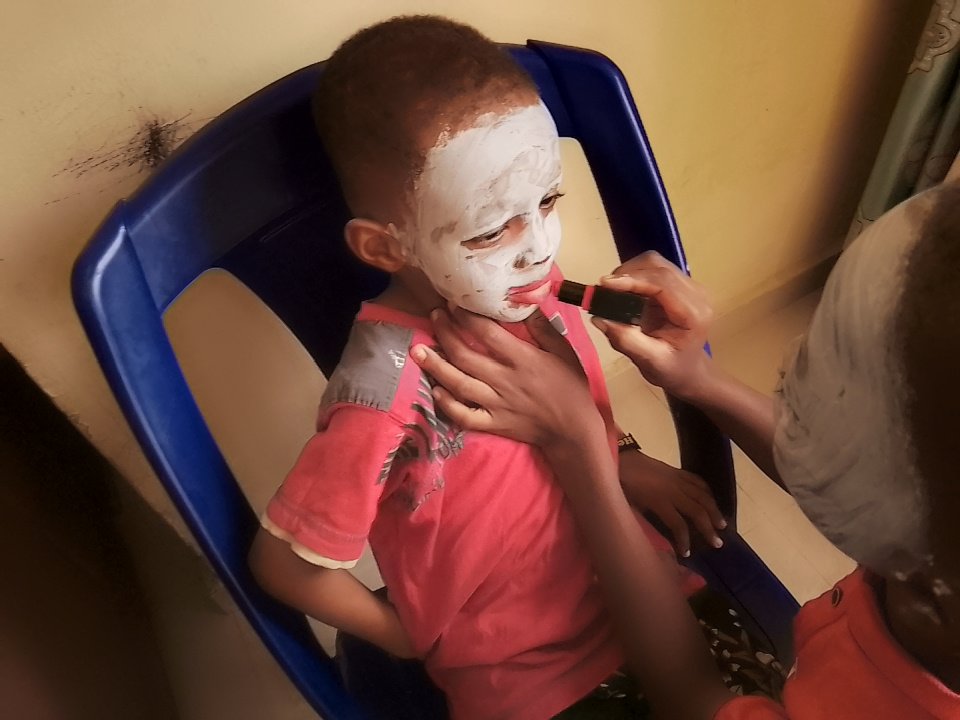 To make it more colourful, white African clay was used to paint the children's faces while red lipstick was used to colour their mouths. The older one was the one who applied the clay chalk and lipstick on their faces while I mainly supervised.