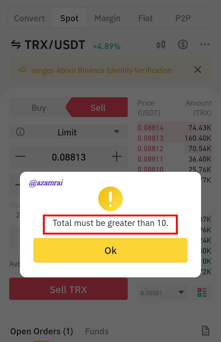 - When I press the sell TRX order it will show me the pop-up message in which they mentioned alert message that you can not able to sell TRX amount that having the worth less than 10 USDT. So, this is why I buy more TRX for 10.99 USDT.