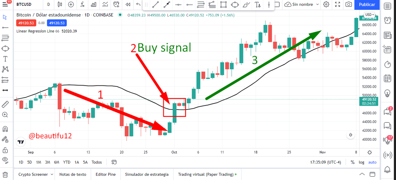 Gráfico BTC/USD, 1D, tendencia bajista (1), luego el precio corta el indicador con fuerza hacia arriba (2) dando una señal de compra, posecionándose el precio por encima de la línea del indiacador y continuando con ua tendencia alcista (3).