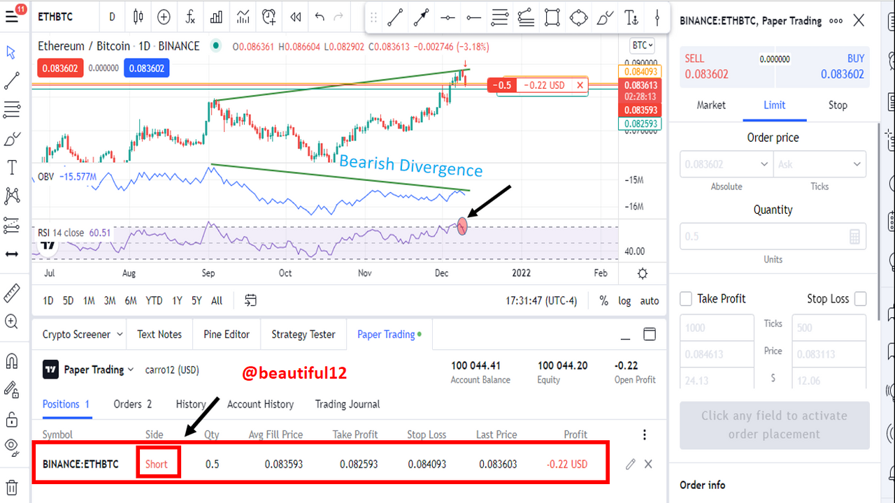 con estas dos confirmaciones decido hacer una orden de venta, donde el Take profit es 2 veces el Stop Loss. Usé el gráfico ETH/BTC 1 Día. Veamos la información en el gráfico.