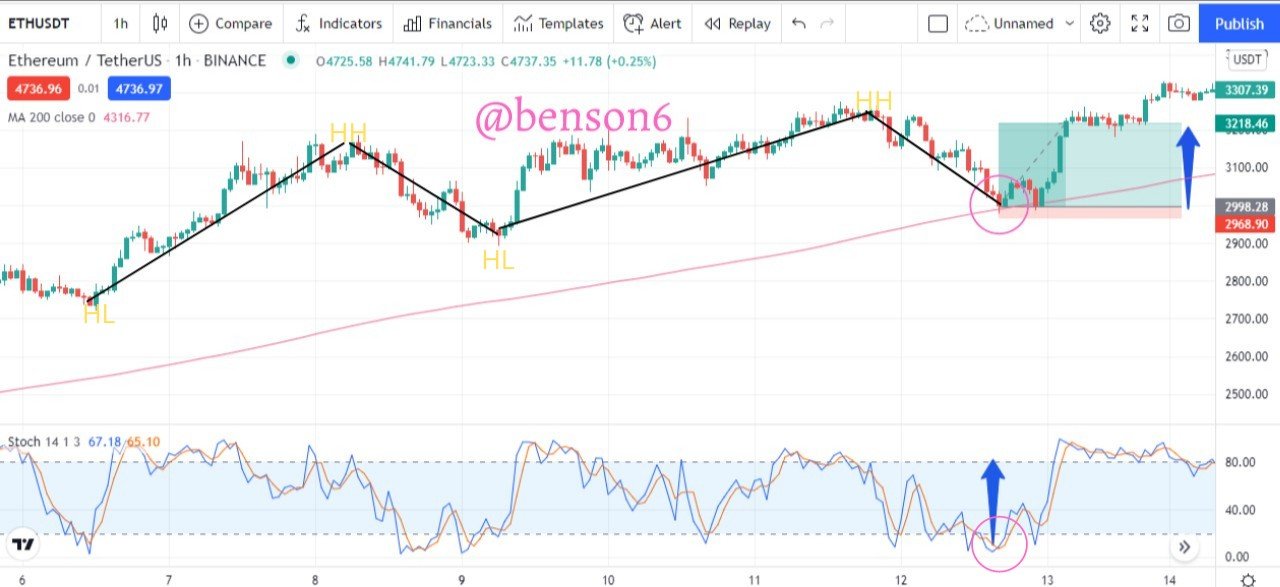 The chart above shows the bullish candlestick pattern and the touch of the candlestick on the 200 moving averages line. As mentioned earlier, the price moved in an uptrend as shown by the series of higher highs and higher lows denoted by HH and HL respectively.