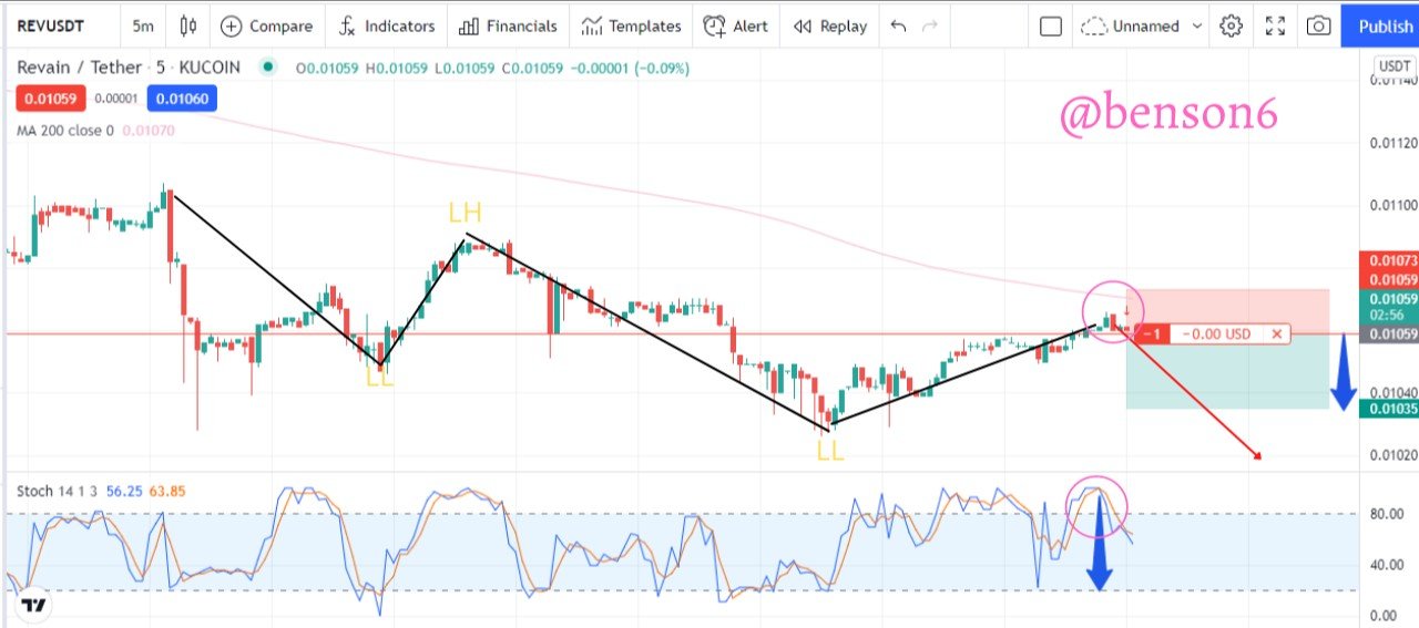 This is a bearish trade of REVUSDT on the 5 minutes timeframe. It follows all the criteria and conditions of the "Perfect Entry" strategy. The market was in a downtrend as shown by the lower lows (LL) and lower highs (LH) of the candlestick formation. Also, the candlestick was below the 200 moving averages line.