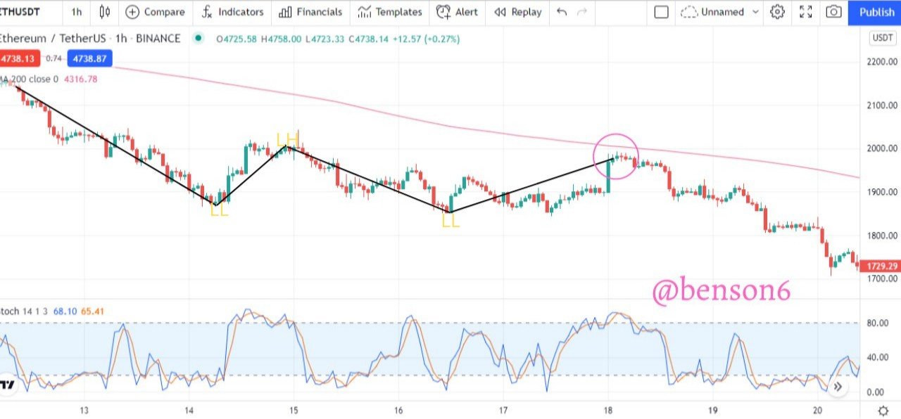 The chart above shows the bearish candlestick pattern and the touch of the candlestick on the 200 moving averages line. As mentioned earlier, the price moved in a downtrend as shown by the series of lower lows and lower highs denoted by LL and LH respectively.