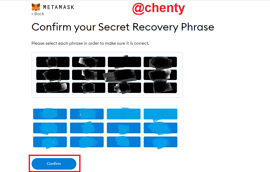 - Confirm the seed phrase in the order it was displayed to you. Click on confirm.