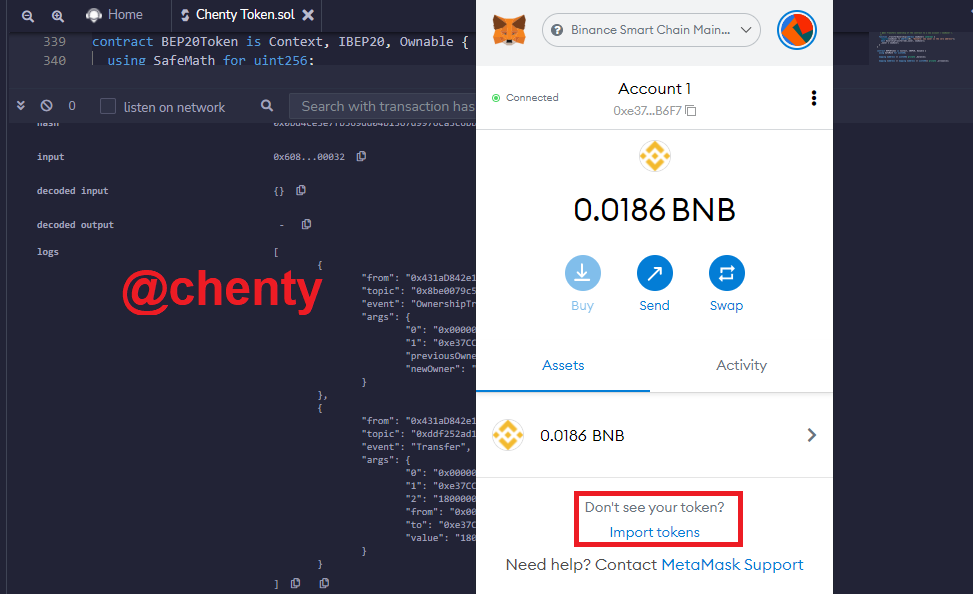 To add my created Chenty tokens into my metamask wallet, these steps are followed.