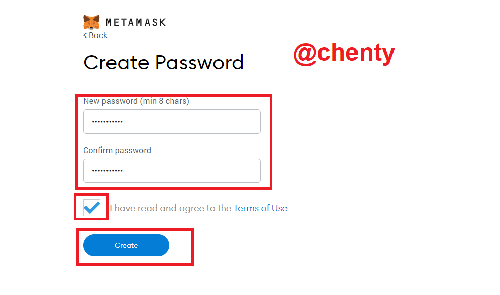 - Enter new password and re-enter it to confirm. Tick on "I have read and agree to the terms". Click on create.
