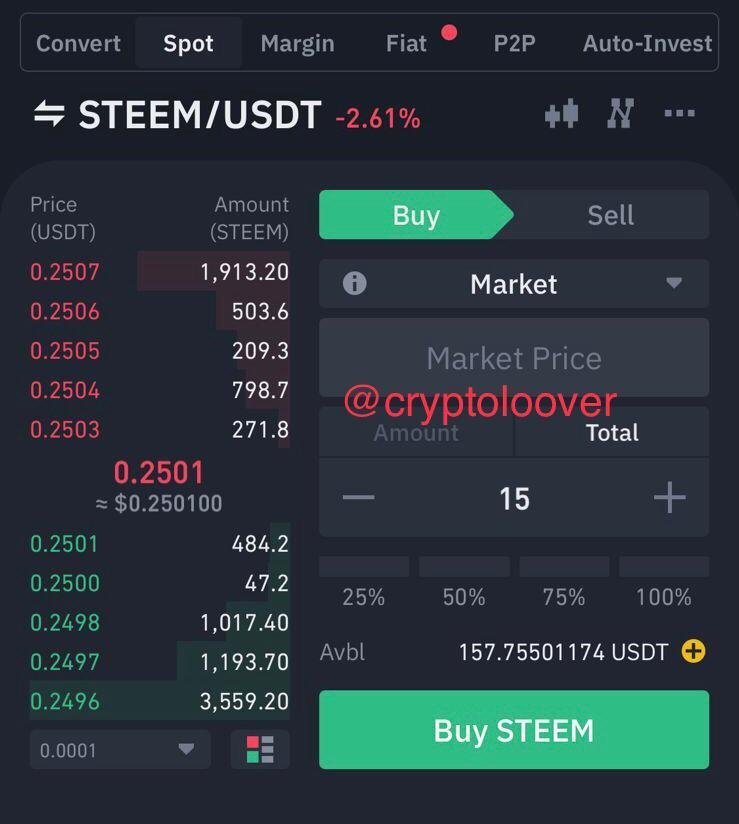 - I have selected the pair of Steem and USDT for the trading here simply select the buy option and enter the amount of USDT that you want to convert into the Steem here I have selected the amount of 15 dollars that will be the almost 59 Steem according to the current price of the market.Now just Click on the Buy option to buy the Steem.