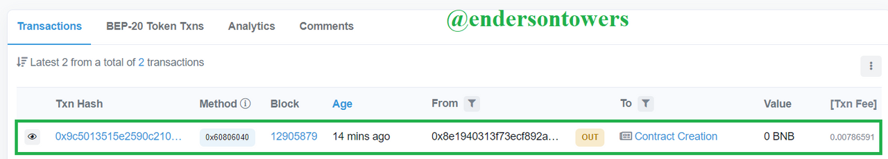Al ingresar a BSCSCAN, podemos verificar las transacciones realizadas para la creación del token, el cual cuenta con los siguientes datos.