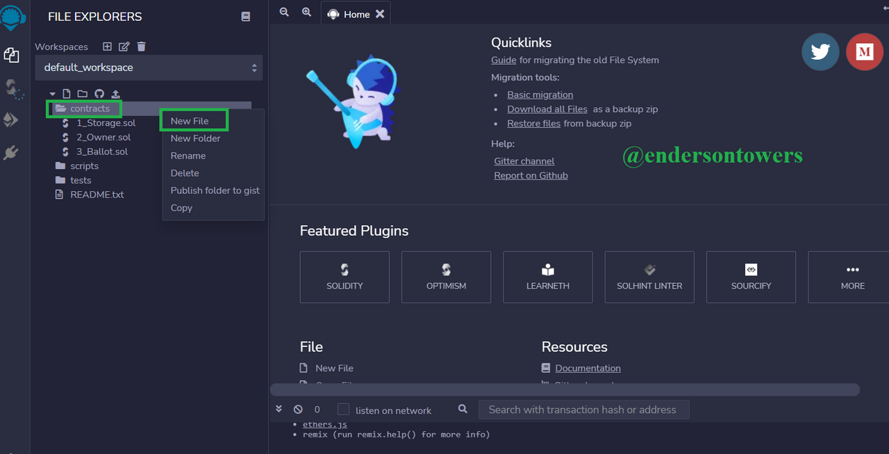 Para personalizar nuestro código fuente en base a nuestro token, debemos ingresar al sitio wed de la herramienta Remix , seguidamente en la opción “File explorers” apreciamos la opción “Contracts” la cual daremos clic derecho sobre ella, una vez nos despliegue el menú daremos clic en “Nueva carpeta”.