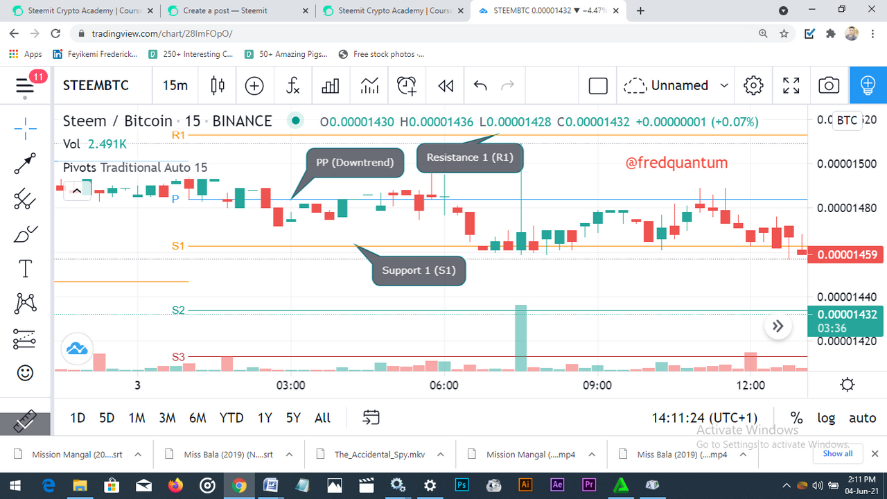 From the above screenshot, the main pivot point (PP) calculated from the summation of the previous day (Daily high + Daily low + Closing price)/3, there was a trend reversal (downtrend) at that point to create Support 1 (S1) below the main pivot point, there was a breakout of price in downtrend movement which led to the creation of another pivot level, Support 2 (S2) and up to Support 3 (S3) all below the main pivot point (PP). Let's proceed.