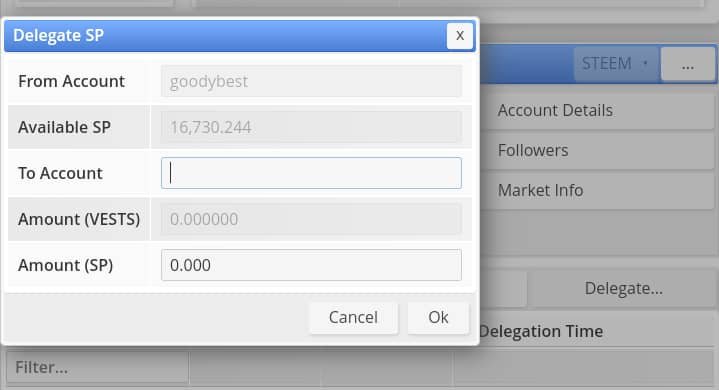- A new page will open for you to see the amount of your available SP, just type the name of the account you wanted to delegate to in the space provided.