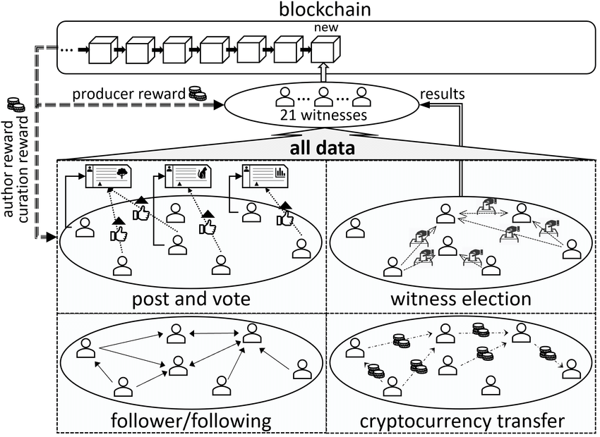 What is the underlying layer used by the Steem blockchain and how does this layer facilitate transactions and interactions on the platform?
