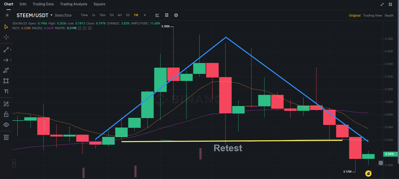 - Chart Analysis: I noticed that Steem had been struggling around the $0.20 mark which acted as resistance level in the past. This Level caught my attention as a potential breakout point.