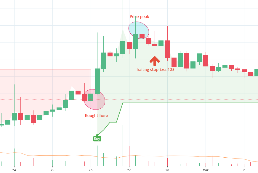 If you put a 10% trailing stop loss then the sell trade will be issued if the price drops 10% from its peak price after you did the purchase. Here's an example: