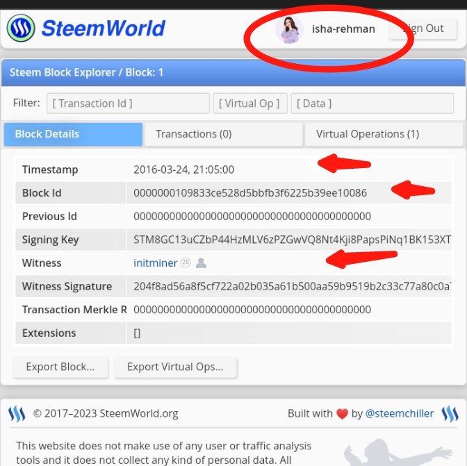 First login to steem world then a home page will appear.secondly click on the block explorer option a new page will open as shown in screenshots.Third step is to write 1 in the block and click on ok option because we want to check the foundation block. Fourth step is a new page will open with information like timestamp, block ID and witness options.