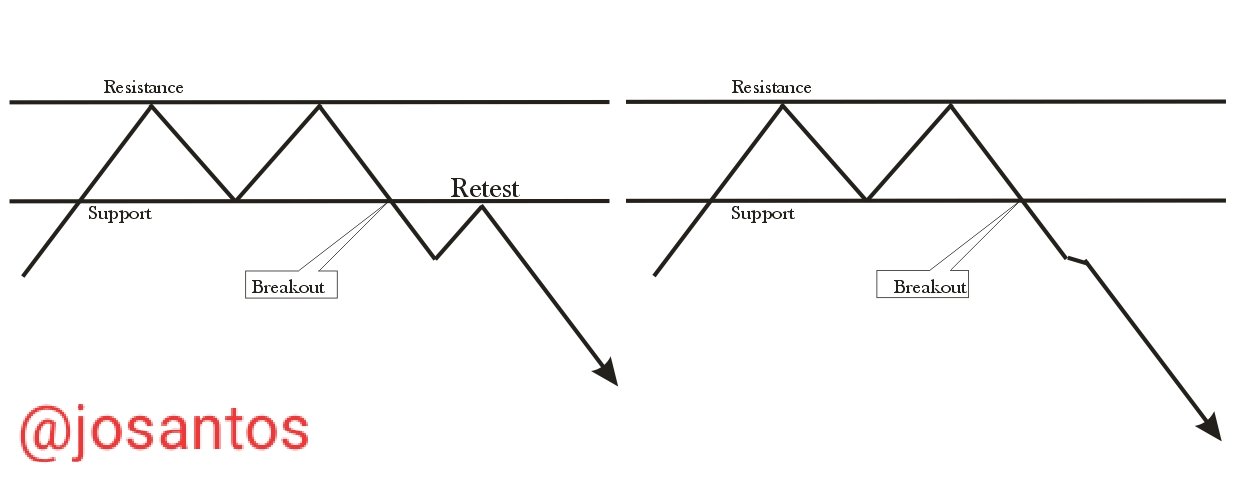 Support breakout can be of two ways I.e once the support is broken, the price may retest the broken support before the movement continues in a downward direction or sometimes, once the support is broken the price does not retest the broken support instead it just moves in a continuous downward direction. Let's consider the screenshot below as it shows clearly a broken support that retest and the a broken support that does not retest.