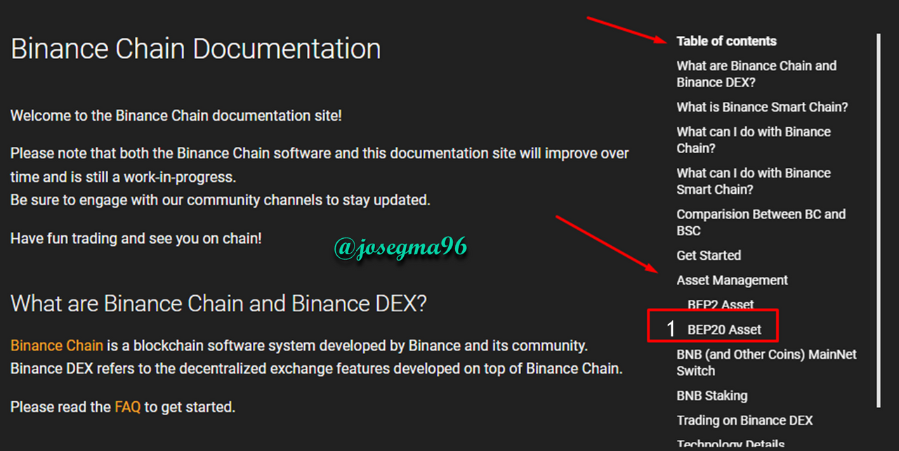 🔽 Vamos a Docs Binance, a la derecha veremos la tabla de contenido, buscaremos ‘’Asset Management’’ y hacemos clic en ‘’BEP20 Asset’’