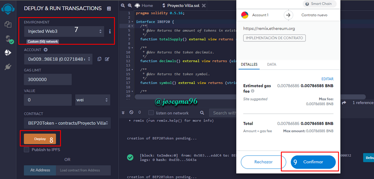 🔽 Ahora que tenemos nuestra wallet conectada Remix IDE, hacemos clic en el apartado ‘’ENVIRONMENT’’ se desplegará un menú con varias opciones y debemos elegir ‘’Injected Web’’, luego hacemos clic en ‘’Deploy’’ inmediatamente se abrirá una ventana de Metamask en donde debemos confirmar una transacción. Por esta transacción nos cobraran una cantidad de comisiones en BNB, al confirmase la transacción tendremos los tokens en nuestra wallet