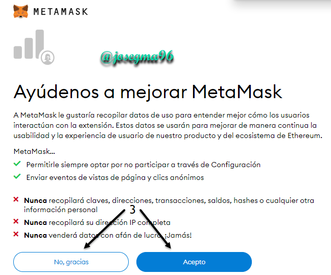 🔽 Como vamos a crear una nueva cuenta hacemos clic en ‘’Crear una cartera’’ y en siguiente ventana debemos elegir si queremos compartir datos con Metamask, esto ya queda a elección del usuario.