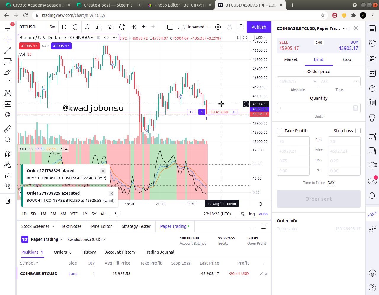 - I then added the KDJ Indicator and opened a new order where I Bought BTC/USD because the J Line was in the Oversold region.