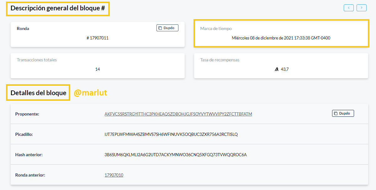 Al hacer clic en uno de los últimos bloques se desplegará un menú con distintos datos, así como una transacción, al hacer clic sobre el ID de un bloque se visualizará los datos pertinentes. Como podemos ver existe un total de 14 transacciones dentro de este bloque.
