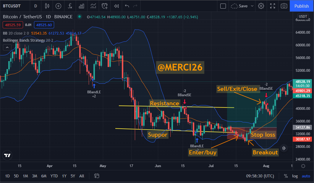 From the trading setup above, trade is placed below the breakout point. We took profit from the top of the uptrend area and placed stop loss below and within the buying position. The bollinger band indicator was applied to confirm trend.