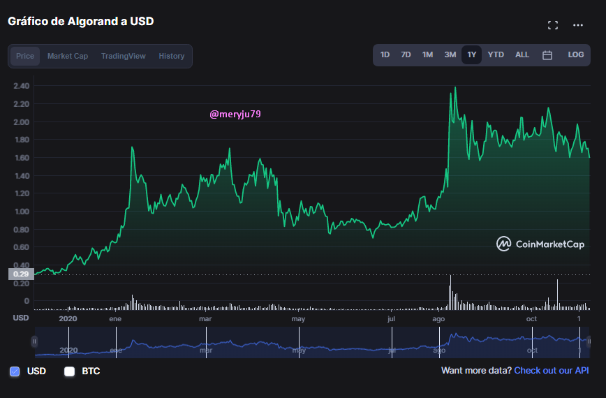 Para analizar el precio entremos en coinmarketcap y busquemos el gráfico de ALGO en el lapso de un año, eso nos permitirá tener una idea de cómo se ha comportado el precio.