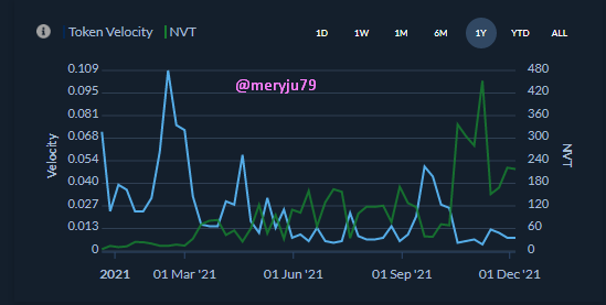 Podemos observar también que el suministro circulante del token aumentó considerablemente en lo que va del año. A su vez también podemos observar una gráfica que compara la velocidad del token y el NVT.