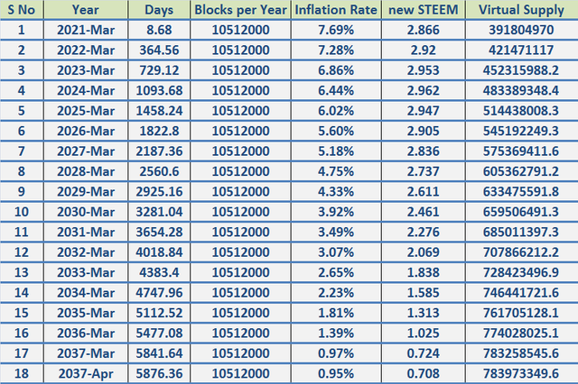 From the below table we get all the information that if we first notice the inflation rate, we will find that its percentage starts from 2021 and decreases to 2037. This means that the inflation rate has been declining for a long time. The new steem is declining with the inflation rate, which was 2.866 in 2021 and will be 0.708 in 2037 marriages. Blocks per year appear to be in the same position at this time. From this we can see that almost everything is going to change in these ten years. And Perth is a huge difference.