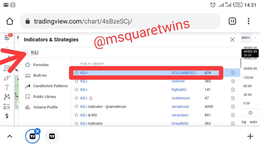 • Then, indicator page will appear. From the search box, search for KDJ ad indicated by the red arrow in the screenshot