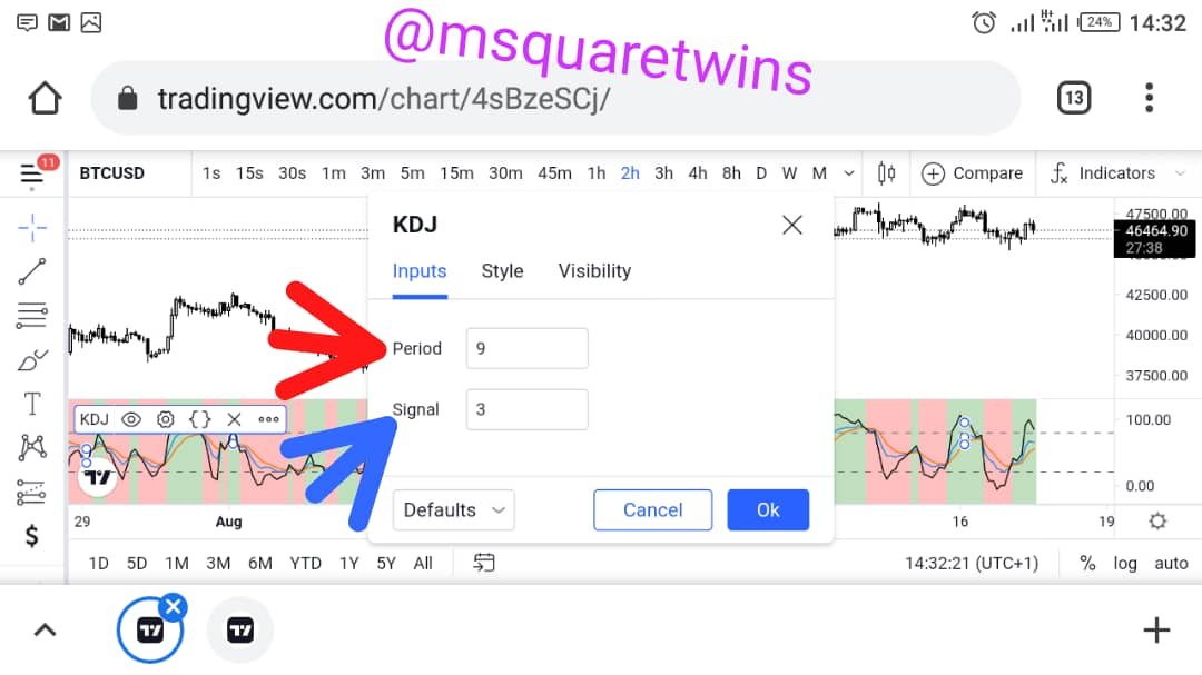 Apart from the above parameters, we also have some parameters. This parameters can be seen from the settings icon as seen from the Fig. 6 below. The default parameters is 9 for period as indicated by the red arrow and 3 for signal as indicated by the black arrow.