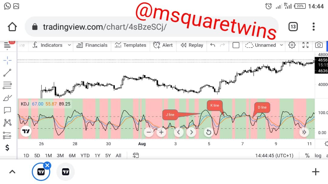 Apart from the overbought and oversold concepts of this wonderful indicator, which help traders to determine the possible entry and exit point, it also has potential of helping traders to know the trend of an asset. The %J line helps in this case. When J line rises above the K and D lines, it means the market is in bullish direction, and for a bearish trend, the J line will lie below K and D lines.