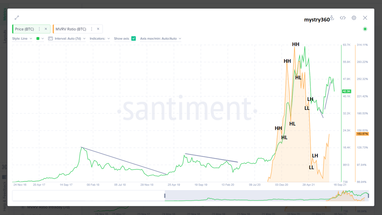 In the above chart you may notice that when MVRV is making HH, HL and the value of MVRV is more than 100% the price is moving in an uptrend where if it is creating LL, LH and value is less than 100% then the price is moving in downtrend.