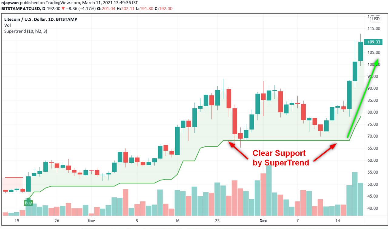 In the chart below you can observe a running market an a clear-cut support line placed by SuperTrend. It is always advisable to enter a buy trade when the support is quite clear since this is an indication of a strong support. You can see that in the LTC/USD chart below, the market runs from around $50 to $65 after which there is a strong support formation. It is ideal to place a buy order here as the build up occurs since there is a high potential of a spike which can send it up as seen here (to $109+)
