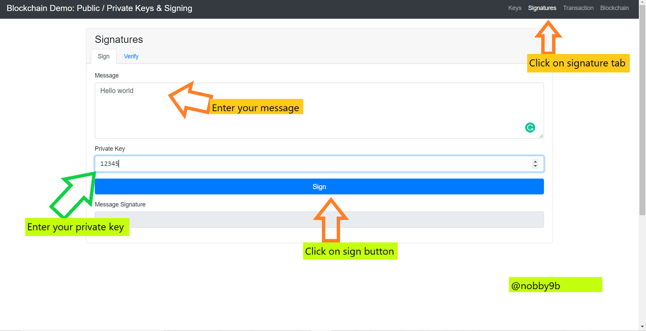 After clicking on sign button we get signature for transaction which has message : Hello world and private key : 12345