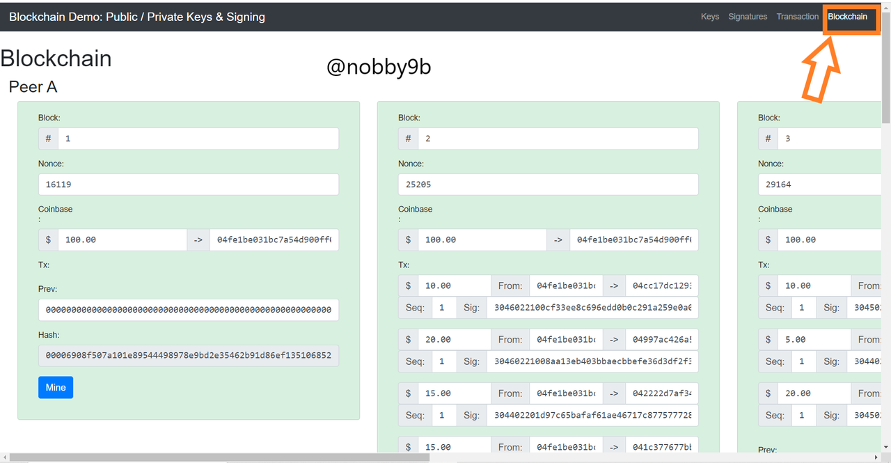 As you can see nonce of block 2 is 25205 and of block 3 is 29164. As soon as we click on mine button below than nonce of block 2 changes to 25146 and nonce of block 3 changes to 12047.
