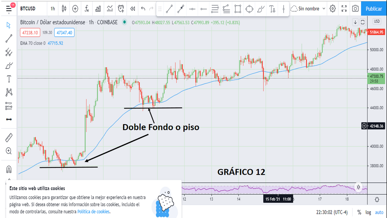 Es el contrario a patrón doble techo, donde el precio del activo llega a un soporte, no puede bajar más, hace un alza y después vuelve a bajar al mismo nivel del precio del activo anterior. Formando un piso, donde la tendencia bajista llega a su fin y hay un comienzo de la tendencia alcista. Veamos el Gráfico 12.