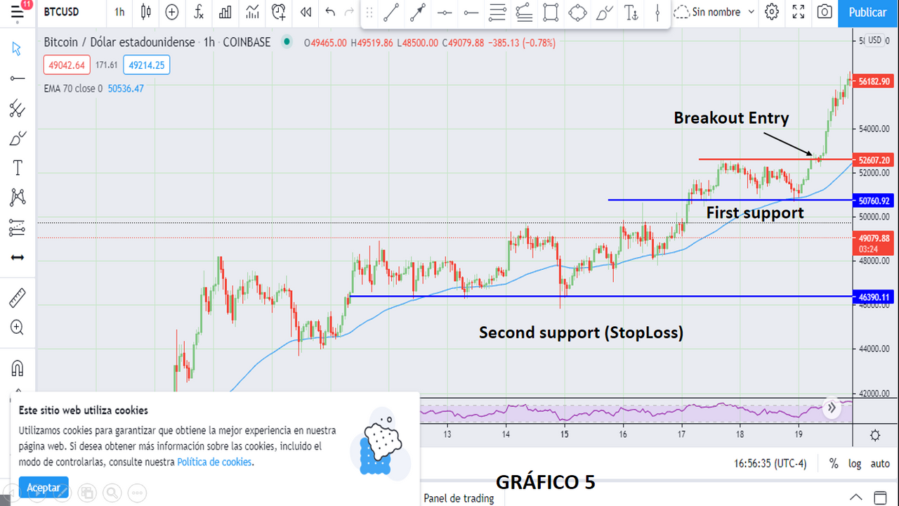 En el Gráfico 5, BTCUSD, tenemos un desglose del precio, donde hay 2 soportes, y al romper la resistencia hay una posible entrada a compra.