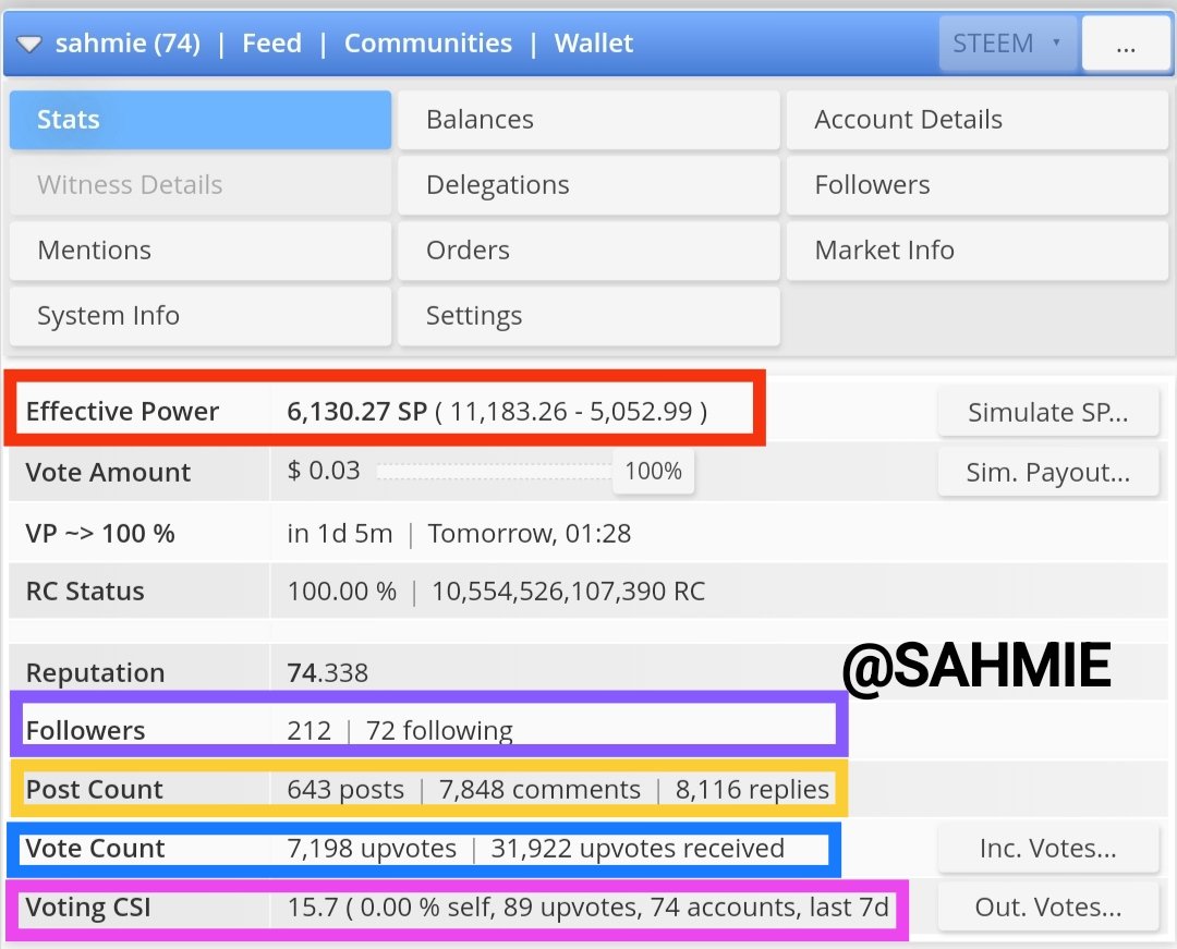 Where the number of users following and I am following is under followers (purple 🟣 rectangle), the number of posts and comments I have made since joining this platform is under posts count (yellow 🟡 rectangle), the number of my users I've voted and those who have voted me is on vote counts (Blue 🔵 rectangle) and lastly the Voting CSI, i.e., the Voting Community Support Index for the last 7 days in Pink.