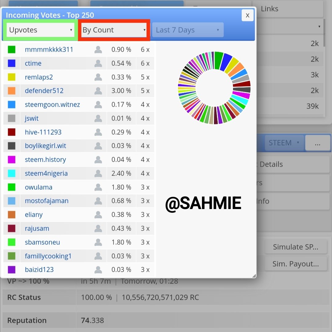 To which we can change to either upvotes or downvotes then by clicking on the red-marked portions, or check the incoming votes by Counts (as in the number of times a user has voted you or you have voted another user in the last 7 days), by Weight (the percentage of their votes or your vote to them) and Amount (how much your vote gives them or their votes gives you).